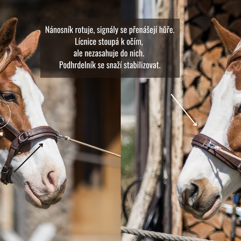 - Při větším tahu za lonž působí se nánosník převrací (minimálně, viz fotka níže) trochu směrem dolů a důsledkem toho jde boční strana nahoru. Při pasování s tím musíme počítat, aby nánosník netlačil po stranách na jařmovou kost (nedáváme však příliš nízko, abychom neohrozili nosní kost).